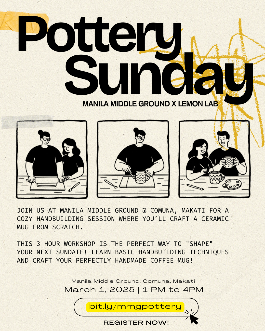 This 3 hour workshop is the perfect way to "shape" your next sundate! Learn basic handbuilding techniques and craft your perfectly handmade coffee mug!