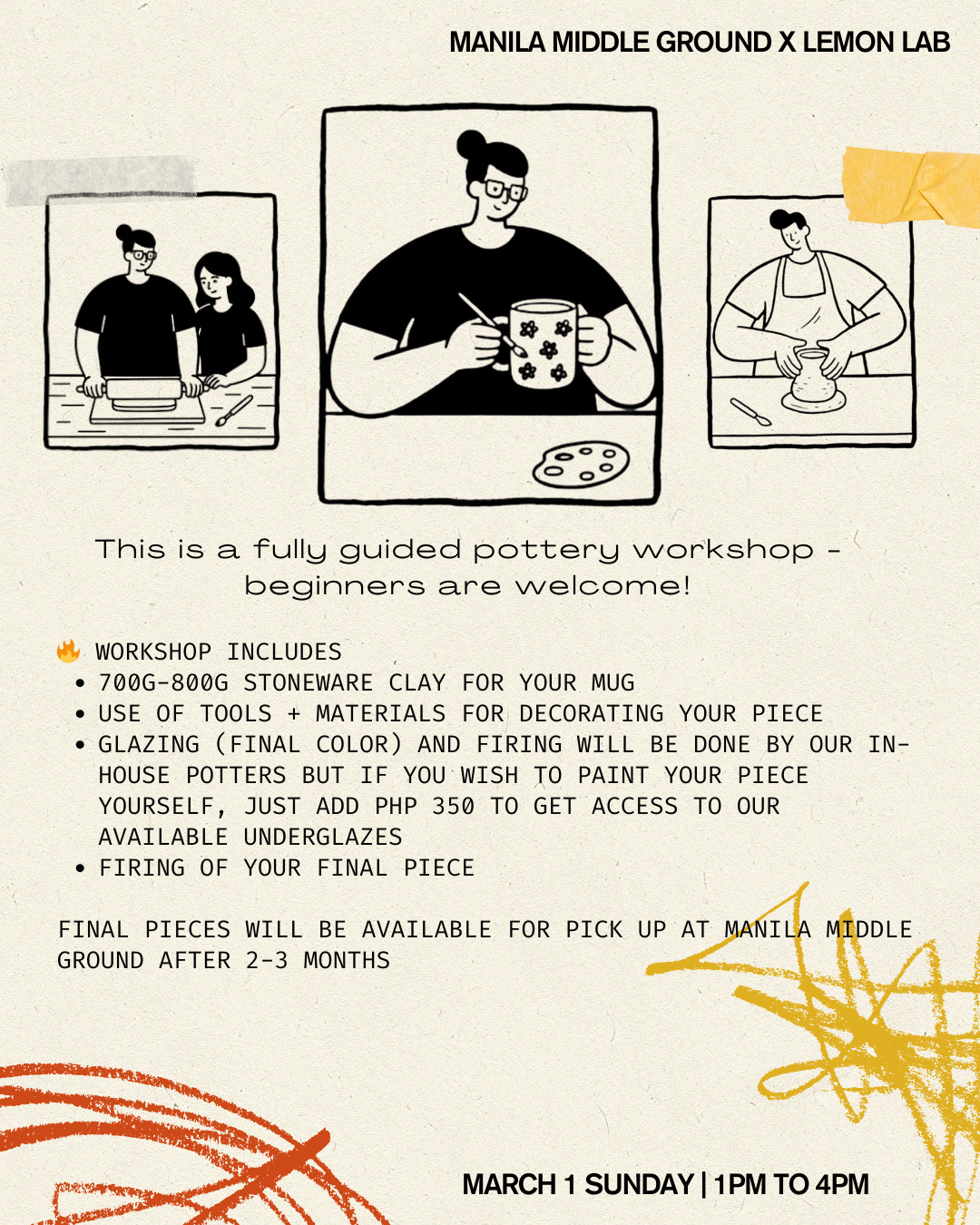 Ceramics can be quite unpredictable most especially for beginners! This means that once in a while, a piece might crack, warp, or not survive the firing process. If this happens, we’ll let you know, but please note that we do not offer refunds for pieces that don’t make it. Remember: you're not paying for a guaranteed final piece — you're paying for the experience, the joy of making, and the skills you’ll build during the workshop.